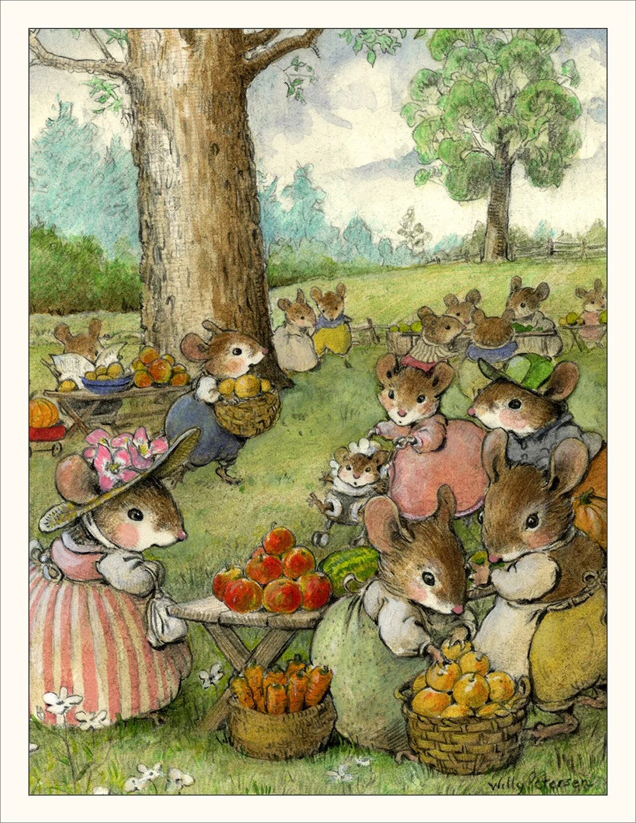 収穫したばかりのりんごや人参、かぼちゃなどを売っているマーケットの光景です。ドレスを着て買いに来ている奥様もいるし、赤ちゃん連れで来ている若い夫婦もいるし、木の下では新聞を読んでいるお父さんもいますね。