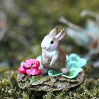 きのことクローバーの上にちょこんと座っている小さなうさぎさん。